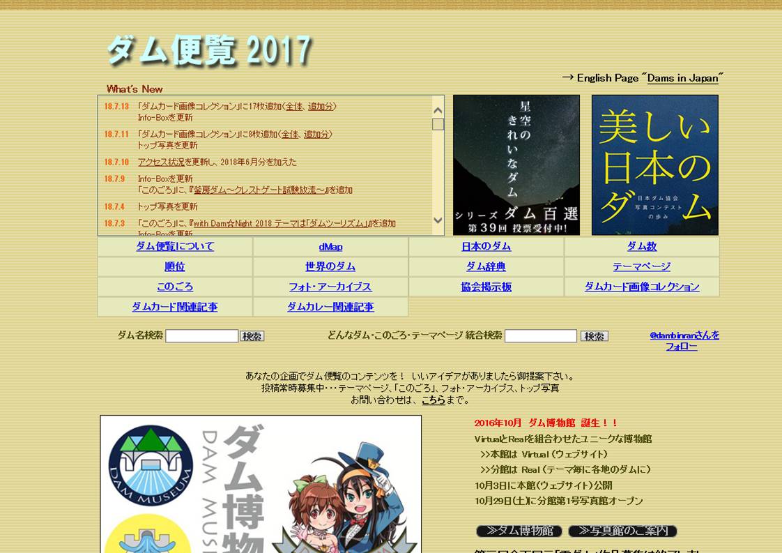 一般財団法人 日本ダム協会が運営するダムに関する日本一の総合情報サイトです。ダムについて、データ、情報、解説、読み物、写真、地図、事典、世界のダム、ランキング、関連サイトへのリンクなど、幅広い内容を掲載しています。