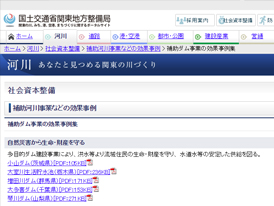 国土交通省 関東地方整備局 河川部の「補助河川事業などの効果事例」のページです。一級河川の直轄区間での事業実施や管理、補助事業、河川、ダム、海岸、砂防などの河川関係直轄事業に関する業務、河川に公園・橋などを設置するための許可等の審査など。