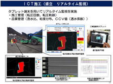 機械(バックホウおよびブレーカ)を使用し丁張り作業の省力化,安全性の向上,個人差の解消を図っている。GNSS 搭載ブルドーザやバックホウを活用し,薄層ストックパイル,切り崩し管理,撒き出し厚管理,コア・フィルタ境界の撒き出しでのコア材の分離防止を図っている。コア材の粒度に画像粒度解析システム,含水比に近赤外線水分計を導入した品質管理,GNSS搭載振動ローラを用いた盛立時の転圧軌跡・回数等の施工管理により,遠隔地からタブレット端末を用いてリアルタイムの連続監視を実施している。
