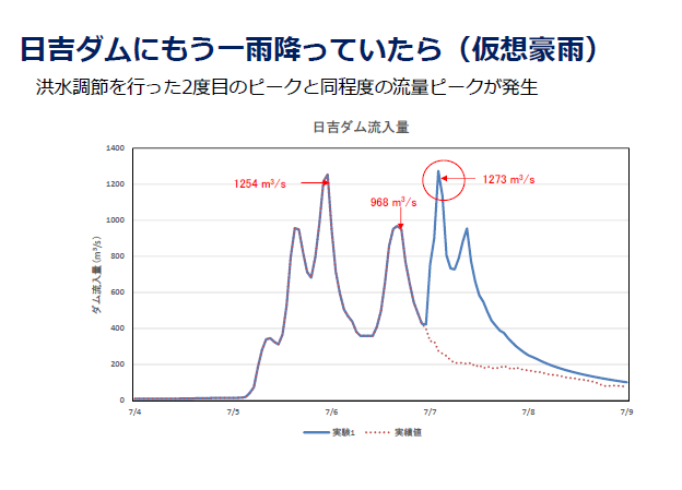 そのようななかで引原ダムの操作では,第二波〜第三波の間に事前放流を行い,異常洪水時防災操作に入る時期を遅らせる操作が行われているのが特筆される。同様に異常洪水時防災操作に入った日吉ダムの操作では,最大流入量1254m3/sを第三波で迎えた以降に異常洪水時防災操作に入り,最後の山では流入量にほぼ等しい最大約900m3/sを放流したが,一連の操作でピーク流量の発生時刻を約16時間遅らせて避難時間を確保するとともに,下流で合流する支流域からの洪水波形との重なりを回避できたことで,計画最大放流量150m3/sを遙かに超える放流を行っても被害は最小限に抑えられた。ただし日吉ダムにもう一雨来ていれば大災害になったと推察される。由良川・加古川流域に降った降雨が異常洪水時防災操作に入ってから日吉ダム流域に降ったとしてシミュレーションしたところ最大1273m3/sが流入し,そのまま放流される結果になった。