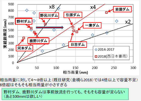 ダムの洪水調節能力を比較する指標の一つに“相当雨量”がある。相当雨量(mm)とはダムの洪水調節容量(V;m3)を流域面積(A;km2)で除して調節可能な雨量に換算したものである。異常洪水時防災操作を行った8ダムを見ると,大きな差があることがわかる。野村ダム,鹿野川ダムはいずれも50mm以下であり,そもそも容量が足りないといえる。