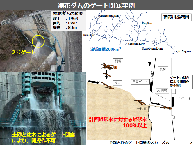 具体的に問題が発生した事例として,裾花ダム(長野県)ではダム上流面の堆砂が著しく進行し,洪水調節を行ったときに土砂と沈木によってゲートが閉塞し,開操作不可となるアクシデントが発生した。この事例を用いて,リスク評価の研究として「n-1」(1門がダウン)条件下においてダムの洪水調節機能のサービスレベルに及ぼす影響を明らかにすることとした。裾花ダムのケーススタディでは,コンジットゲート門数が2門なので「n-1」条件では1門が使用できないことになる。そうなれば洪水調節容量を十分に生かすための放流能力が不足し,過剰貯留とそれに伴う異常洪水時防災操作への早期以降,ピーク放流量の増加が発生することが明らかになった。今後の研究課題としては,沈木によるゲート閉塞のメカニズムの検証,ダム湖底の堆砂および沈木の特性把握と予防保全対策である。