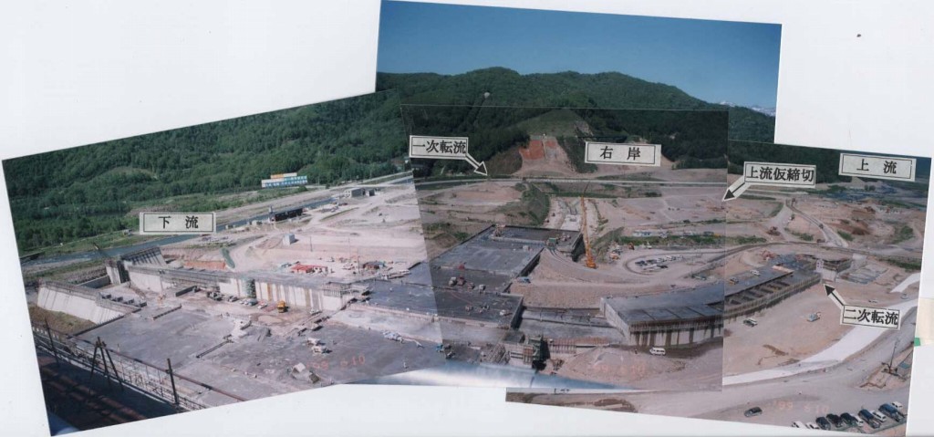 現在の進捗状況はコンクリートダム部約49万m3の打設が終了しており、フィルダム部は上流仮締切での試験盛立を開始していた。監査廊部は砂礫部の地中連続壁の施工が終わり、監査廊コンクリートを施工中である。転流は1次転流をフィルダム側に設ける開渠水路方式、2次転流はコンクリ−トダムに設ける堤内仮排水路トンネル方式であり、今秋に2次転流を行うとのことであった。