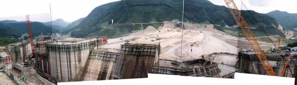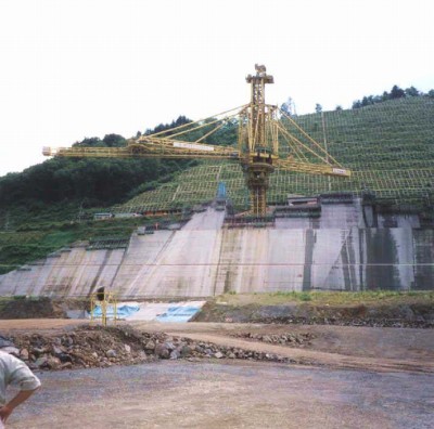 洪水吐コンクリート打設に「タワーベルコン」を使用 左岸側盛立及び監査廊の施工状況