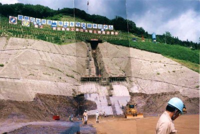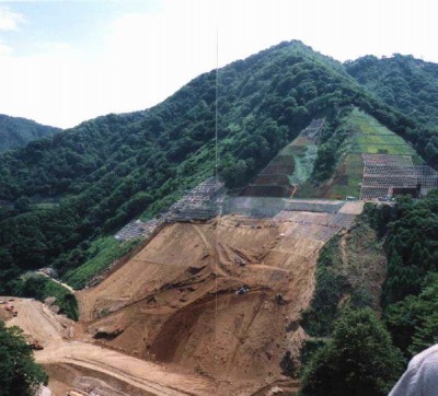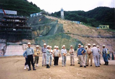 左岸側より堤体盛立状況全景。手前は洪水吐。 (クリックで拡大表示します) 堤体盛立現場にて見学状況(右岸側)