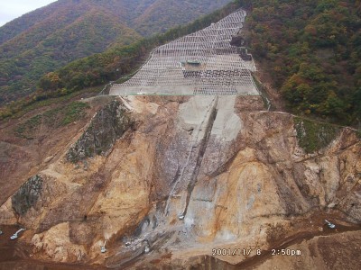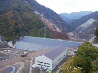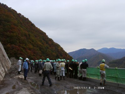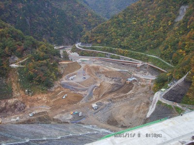 写真-1 徳山ダム右岸天端から掘削中の現場を見学する 写真-2 左岸掘削状況 写真-3 徳山ダム下流方向を望む 写真-4 徳山ダムの上流2次締切り (CFRD施工に備え、洗掘防止用仮設遮水シートを上流面に施工してある)