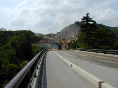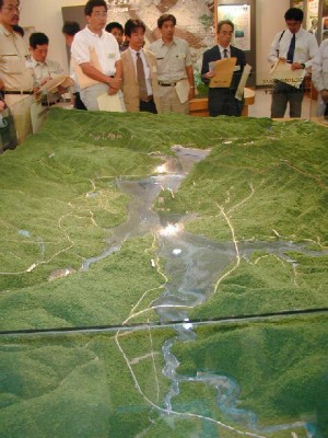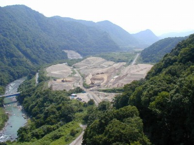 ダム周辺の模型(胆沢ダム学習館) 付替国道7号橋から左岸上流を望む。前方の尾根はカットする。 付替国道洪7号橋から堤体部分を望む。 現況は掘削材の仮置き場となっている。