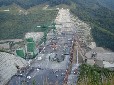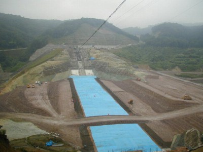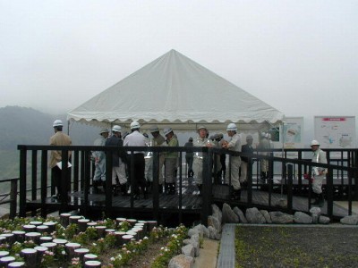 質疑状況 左岸天端の展望台 堤体施工状況(雨天のためコアゾーンをシート養生)