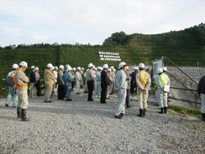 船上山ダム右岸側での現場説明 上方に船上山(616m)を望む