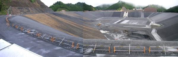 上部調整池の基礎地盤は、新生代古第三紀始新世〜漸新世の四万十累層群の日向層群であり、砂岩と頁岩の互層からなっています。上部調整池は当初、主・副ダムとも中央遮水壁型で、遮水方法はグラウチング工法としていました。しかし、地質調査により地山の高透水性状が明らかになったため、全面表面遮水型に変更されました。遮水材料はアスファルトが選定され、遮水壁の舗装面積は約30万m2で、国内最大の全面表面遮水壁型です。