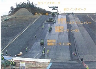 遮水壁の施工は各層毎に、アスファルトコンクリートの製造・運搬・敷均し・一次転圧・二次転圧の順に施工されます。このうち、斜面部の施工は、ウインチポータ、ダンパー車、斜面用アスファルトフィニッシャ、斜面用振動ローラ機等の専用機械が用いられています。また、国内のアスファルト遮水壁としては初めて舗装幅5mのアスファルトフィニッシャが用いられているそうです。現在は1日2レーンで施工されているそうですが、今後1日3レーンを目指しているとのことでした。