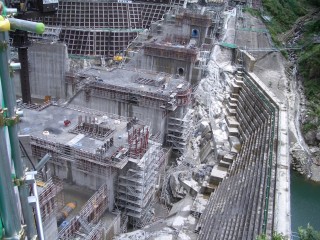 コンクリート打設設備は、タワークレーン(16.5t×75m)+コンクリートバケット(4.5m3)で構成されています。堤体積規模に対してタワークレーンがオーバースペックである印象がありましたが、地下発電所空洞の掘削ズリを有効利用している骨材が非常に良質で、ダムコンクリートの単位体積重量が約2.53t/