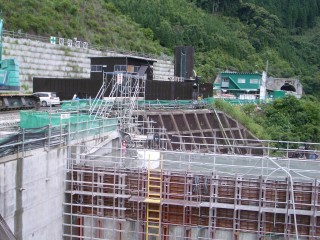 下部ダム(石河内ダム)は、堤高47.5m、堤頂長185.0m、堤体積(減勢工含む)約13.3万m3のコンクリート重力式ダムであり、見学時の工事進捗状況は約73%でした。ただし、見学当日は台風通過直後であったため、残念なことに本体打設は行われていませんでした。