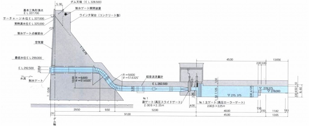 また、玉川ダムの利水放流計画から、下流に位置する鎧畑ダムでも最大69.1m3/sの放流が必要となり、平成元年に利水放流設備の新設工事が実施されています。