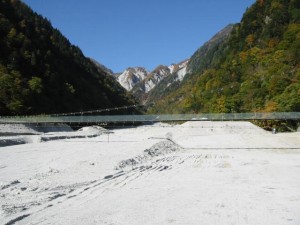 | 高瀬ダム貯水池左岸の濁沢、不動沢の上流には、大規模な崩壊地があり、この影響で高瀬ダムの堆砂は想定の1.7倍のスピードで進行している。写真−4の吊り橋は、ダム建設当初は桁下30mに川が流れていたが、現在は工事車両が通れるように開削している状況である。 |