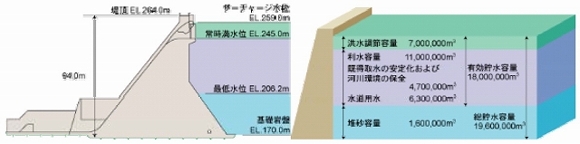 ダムの目的としては、洪水調節、既得取水の安定化・河川環境の保全、新規利水としている。当ダムの特徴として、下流の堤趾部付近では主として安山岩グループのCL級および自破砕安山岩グループのCL’級が分布している。そのため、ダムの基本形状はミドルサードの条件とHennyのせん断摩擦安全率を共に満足する標準断面形状のうち、下流堤趾の応力負担を小さくする形状としている。