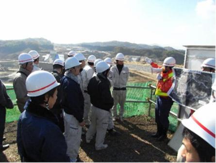 講演会場で香川用水の事業概要及び香川用水調整池の工事概要をお聞きした後、香川用水調整池工事現場へ移動しました。現場を一望できる見晴台で工事の概要・進捗状況等の説明を受けた後、場内へ移動し、貯水容量を確保するための池内掘削の様子や堤体の盛立状況を見学しました。現場では盛立材料の品質管理方法について質問する様子や、盛立材料を直接手に取って感触を確かめる学生の姿も見られました。