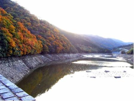非かんがい期のため抜水中の豊稔池と紅葉に色づく湖畔の様子