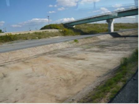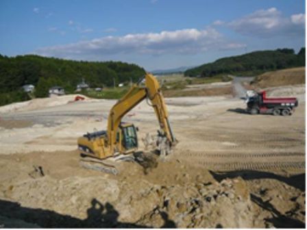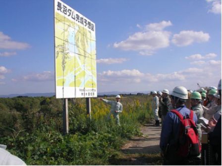 見学会当日は、晴天に恵まれた見学会日和となりました。現地では、迫川右岸の砂原水門の施工状況と対岸の南谷池遊水池の見学を皮切りに、長沼北側の伊豆沼からの荒川が導水路を横断する荒川水門を見学しました。次に、10月13日に定礎式を迎えたばかりの長沼主ダム本体を見学し、土取り場へ向い堤体材料を見学しました。