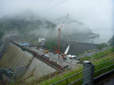 しかし、天候の関係から現場は本体コンクリートの打設が中止となり、合理化施工であるRCD工法による施工を見学出来なかったことと、合わせて本日、本体コンクリート80万m3達成を見届けれなかったことが非常に残念でした。また、このような状況でしたが、学生たちは傘をさしながらもダムのスケールの大きさに圧倒されているようでした。
