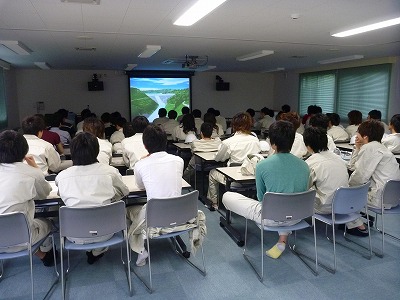ダムの見学は、ダム本体の施工標高がかなり高くなっているため、一般技術者と学生の2班に分けた見学とし、学生はインフォメーションセンターでダム概要の説明を大成・地崎・中山特定建設工事共同企業体より受けたあと、見学展望台から工事状況等の説明を受けました。一般技術者は先に見学展望台での工事状況等の説明を終えたあと、ダム工事経緯、打設工法(RCD)、当ダムで創意工夫した施工技術など技術的な説明を受けました。