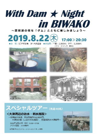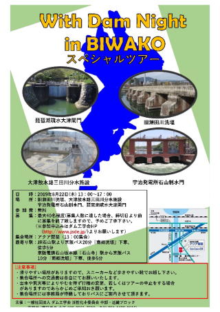 今回のダム広報イベントでは、旧瀬田川洗堰・宇治発電所・大津放水路・琵琶湖疏水の見学会とwith Dam ★ Nightを組み合わせて開催致しました。水シンポジウムとの同日・同場所での開催ということもあり、100名の方々に参加していただき、大盛況で終えることができました。