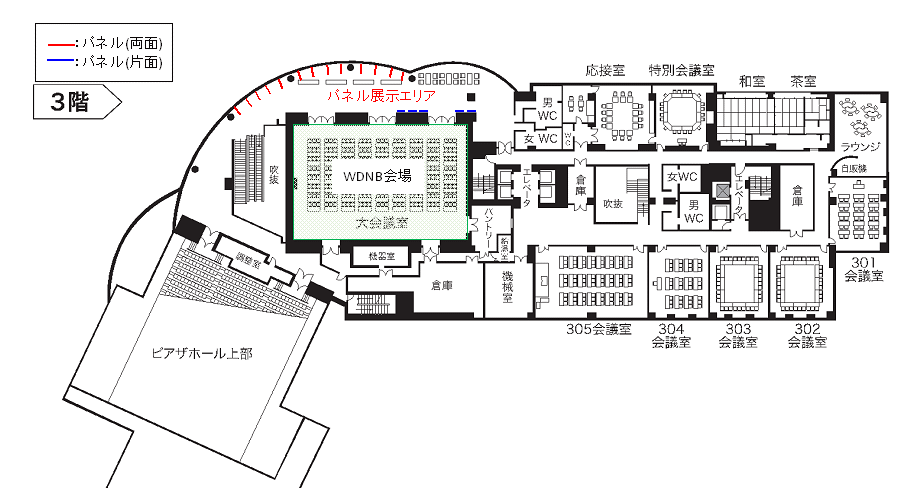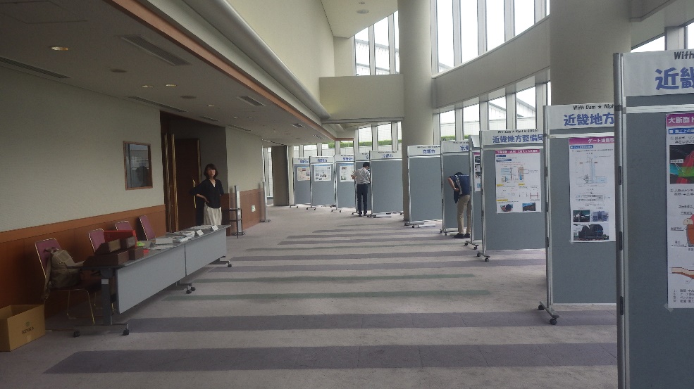 パネル展はダムに興味のある方だけでなく、WDNB前に開催されている水シンポジウムの出席者の方など多くの方の目に触れてもらうため、8/22(WDNB開催日)の15:00~19:00まで、水シンポジウム開催場所と同じピアザ淡海3階で開催しました。