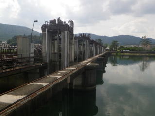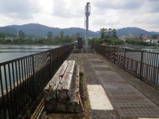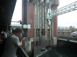 る為に造られた旧瀬田川洗堰の歴史を詳しく説明していただき、当時は地元住民だけが通行を許 されていた、洗堰の天端を実際に歩いて見学しました。その後、現在の新瀬田川洗堰を見学し、