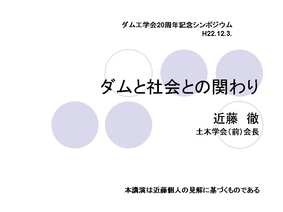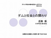 なお、これは冒頭でも示しましたが私の個人的見解で、国土交通省の見解ではありませんし、またお話しするのは、私の経歴から、国土交通省にかかわるダム事業が多くて、例えば農水省や電力会社のダム等は資料が手もとに何もありませんのでお話ししません。私の身の回りで感じたことをお話しさせていただきたいと思います。