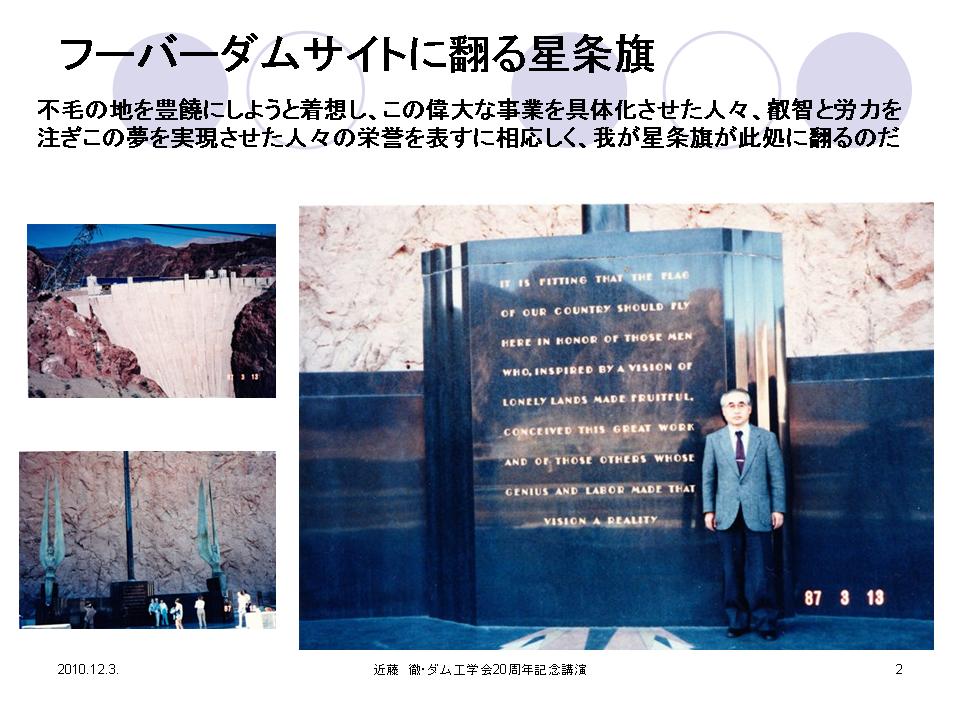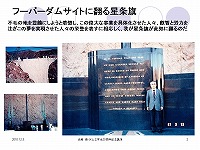 この左の写真がフーバーダムで、ネバダ州とアリゾナ州の州境にできているダムですが、右岸側のネバダ州側にここに見るような旗が掲げられており、その旗のもとにあったのがこのモニュメントで、要するにアメリカとしての誇りを持ってフーバーダムを造っているということでした。