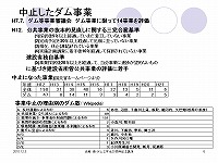 このダム事業審議会は平成10年から始まったと思いますが、遅れて12年に政治の方も公共事業の抜本的見直しに関する三党(自自公)合意基準、それから同時に建設省独自基準で5つの評価基準で既着手の全ての事業を見直そうということになりました。以来、事業の見直しを毎年行ってきまして、中止された事業が図−6の一覧表で、これは国土交通省のホームページから私がとった資料でございます。抜本的見直しが始まった最初のころは、全体で190事業、ダムは大きなシェアを占めて47事業ですが、最近は中止という事業は極めて少なくなっております。