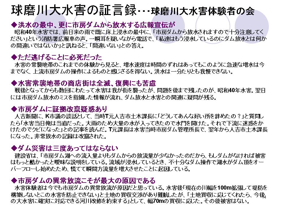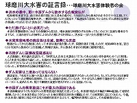 ダム災害は三度あってはならない。建設省は「市房ダム湖への流入量よりもダムからの放流量が少なかったのだから、もしダムがなければ被害はもっとひどかった」とあいまいな説明をしている。流域が浸水しているとき、不十分なダム操作で湖水がダムの頂をオーバーフローし始めた、慌てて瞬間放流量を増大させたことに起因している。市房ダムの異常放流こそが最大の原因であるという証言もあります。これを見ると大変な誤解だと思うのです。