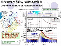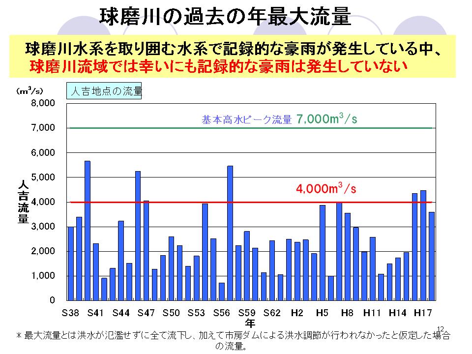 図-11に40年洪水の写真と新聞記事,図-12に球磨川の過去の最大流量を示します。この昭和38年、39年洪水の流量を見てみますと、この図のようになっていて、4,000tというのは川の下流の河道計画の流量です、7,000tはダムの計画が対象とする基本高水の計画流量。100年に1回の洪水を7,000tぐらいにしましょうというのが結論でした。しかし、過去の洪水を見ると結構河道の流下能力を超える洪水が頻発しております。住民の皆さんは、昭和35年に市房ダムが完成する前、洪水は起こっていないのだ。35年、市房ダムが完成してから起きているのだというようなことをおっしゃっています。確かに連続して洪水が発生したというのは住民にいろいろな心証を招いたのではないか。その上に、市房ダムが完成しているというようなことも含めて、いろんな誤解を招いているのじゃないかというふうに思います。