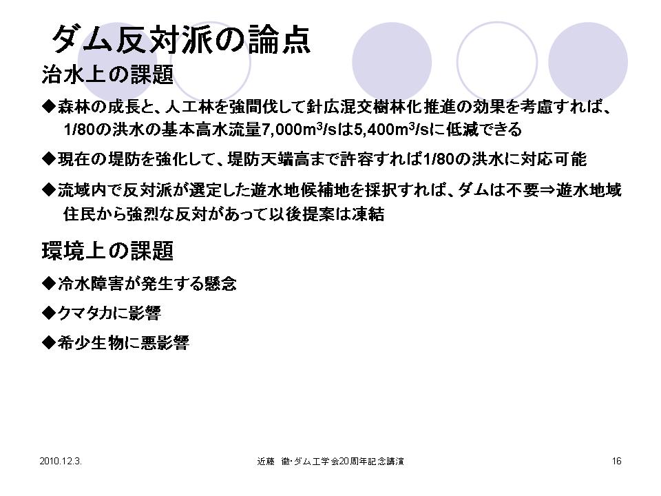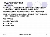 八ツ場ダムで500世帯に動いてもらうのに四十年かかったけど、それでは下流で、水深二、三mで何万人もの人の家が水に浸かってもいいのかという話はそう簡単な話ではありません。そこの難しさをわかって、じゃ一人でも反対したらやめるのか、ダムに頼らざる治水手法は、もっと母数をふやして、話をつける手順に時間がかかります。それは、最後は政治が決断してもらわなくてはいけません。そこまでまた提案もしていかなければならない。それでないと、ダムに頼らない治水の方法というのは、簡単にはあり得ないのです。その話までちょっとしようと思っていましたが、十分に話せる時間がなくなりました。