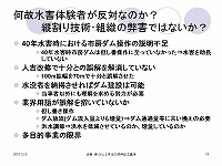 ただ、住民にはこれがまだ通じていない。森林の状況が昔と今で変わったと思い込んでいます。それが誤りであると説明するのに、図-17の資料はいい資料だと思います。まとめとして言いますが、なぜ水害体験者が反対なのか。これは私の独断でありますが、事業を行う側の縦割り技術・組織の弊害ではないか。40年水害時における市房ダム操作の説明を徹底的にしていない。関係者がいないので、いてはごめんなさいですが、これは熊本県のダム担当組織の問題ですが、ダムは水害を助長していないということをなぜそのときから一貫して説明してこなかったのか。