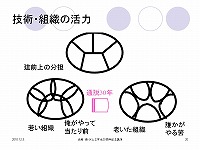図-20は、技術・組織の活力についての模式図です。これは畑村洋太郎さんという失敗学の先生のおっしゃっているのをちょっと借用したんですけど、組織というのは、真ん中の上の図のようにきれいに分担しているはずで、建前はこうですけれども、左下の図に示す若い組織というのはまだ組織の分担が決まっていませんから、人の分野まで出ていったりして、全体として何となくうまく分担しているのです。だんだん組織が老いてくると、これは先生は30年と言っていますけど、30年ぐらいたつと、右下の図のようにお互いの間にすき間が出てくる。まさに川辺川ダムの場合は、こういうすき間が結局誤解を招いているのではないかというのが、私の推理です。当事者の方がいたらごめんなさいです。また、私の言うことが誤解だったら誤解ですと言ってすぐ取り消しますが、ただ、こういうことはあり得ると思っています。国土交通省は、どっちを向いて仕事しているのだ。第1に、組織全体が受益者たる住民を向いて仕事をすべきにもかかわらず、ダムをつくることが目的化したことによって、河川の改修を担当している職員は、ダムの事務所はダムをつくりたくてやっているのだ、俺は関係ないので川の改修をやるとか、ダムの管理事務所の職員はダムの管理を間違いなくやってさえいればいいんだというようなことになっていたとすると、組織全体では力の出るのが分散化して、ばらばらな組織の集合体になってしまっているのではないでしょうか。