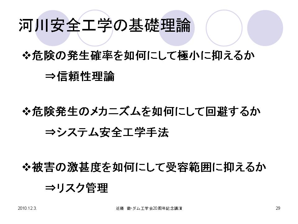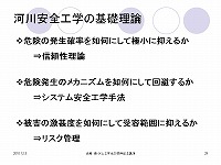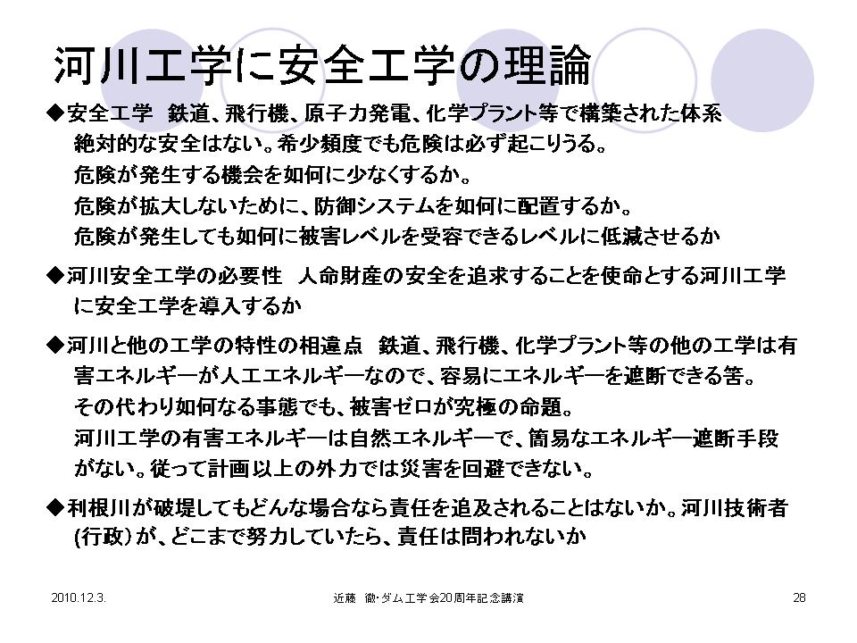 この辺、飛ばしていきます。図-27は八ツ場ダム中止の議論を主導してマスコミにも出てしゃべったり有識者会議でもしゃべった反対派の主張であります。これは単なる技術論にすぎない。技術の奥に流れている安全をどう確保するかという哲学が全く欠けていると思います。流域面積や雨の降り方などの枝葉末節なところでダムは要らないという議論が出てきます。後で読んでいただければいいと思いますが、私は安全工学というのを最近提唱しております。魚本先生も安全工学を専門にやっておられるようなのですが、私も安全工学について少し話させていただきたいところですが、飛ばさせていただきます。(図-28,29,30,31参照)