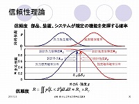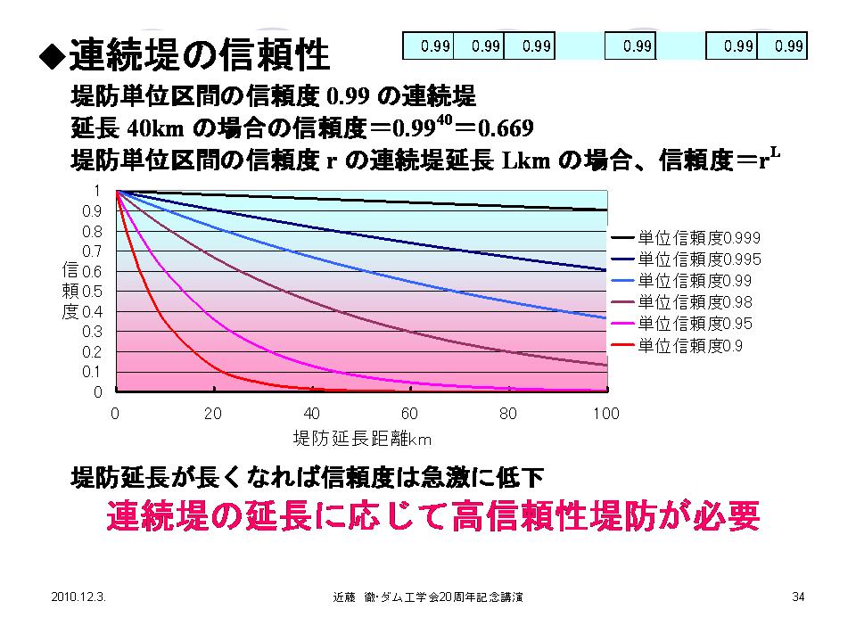 図-34は、連続堤の信頼性です。信頼度というのは危険度の反対で、その施設が所定の機能を発揮する確率で、1マイナス危険度と見ていただくとわかりやすいと思います。1kmの堤防で100回洪水が来て1回だけ切れるという堤防を考えてみたときに、信頼度は100分の99という青い線になります。100kmの連続した堤防になると、全区間が全て破堤しない確率というのは100分の99の100乗ということで0.35ぐらいになります。洪水が3回きて2回は破堤するという確率なのです。