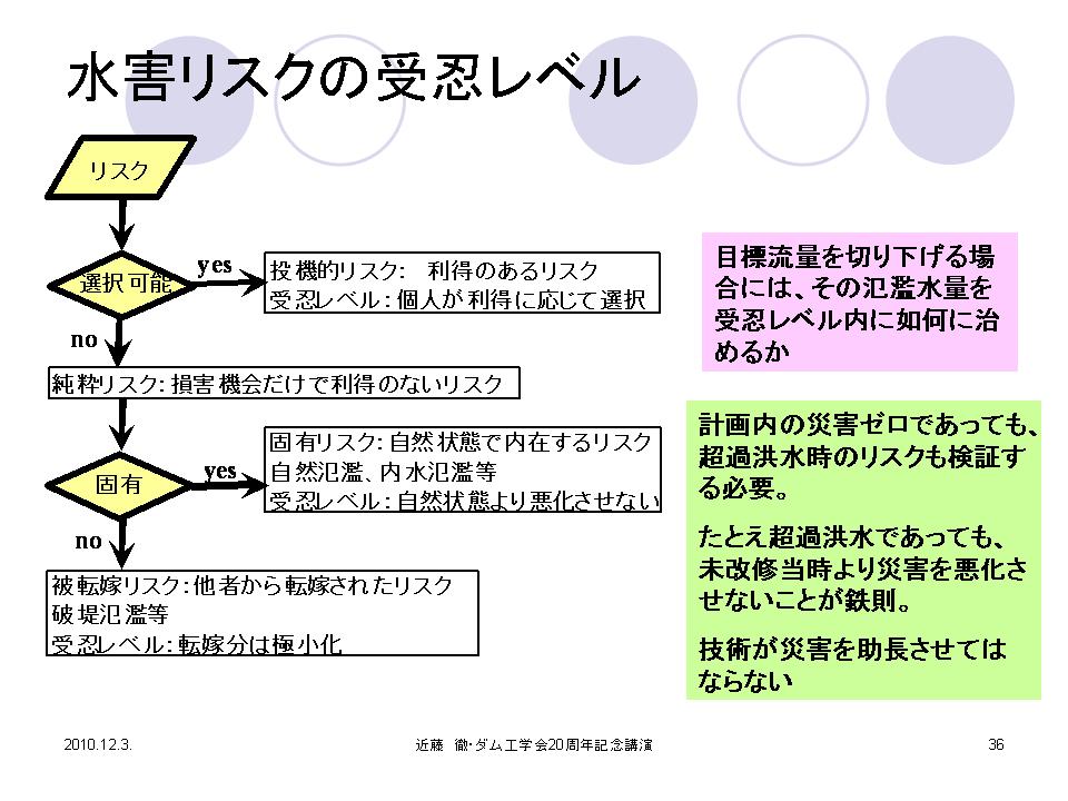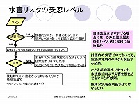 強制的なリスクとして、もう一つに被転嫁リスクがあります。工学者は、固有のリスクは受忍のレベルに抑えることでいいと考えますが、被転嫁リスク、例えば上流を改修して下流へ水を集めて持ってきてそこで破堤されるリスクを大きくするようなことは絶対防がなくてはいけません。リスクの受容レベルは限りなくゼロでなければなりません。破堤によって家を流されるというのは何としても回避しなくてはいけないと考えます。破堤リスクの回避というのは、これは徹底的に追求すべきであります。そういう意味では、ダムは大変有効な事業であります。