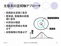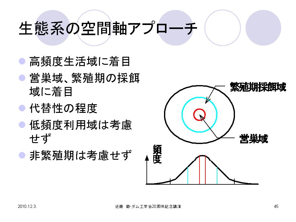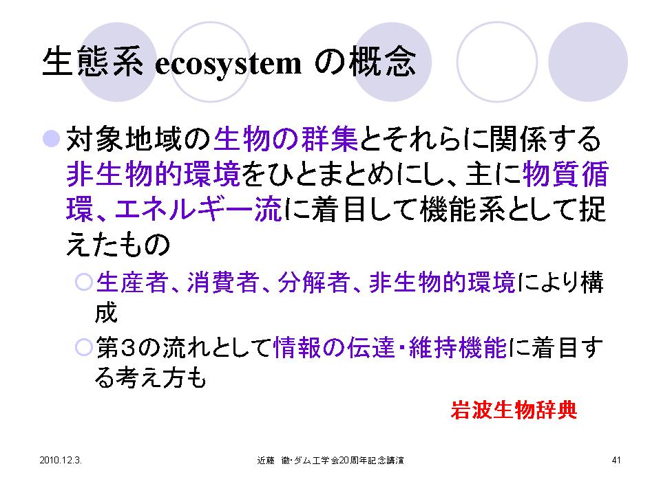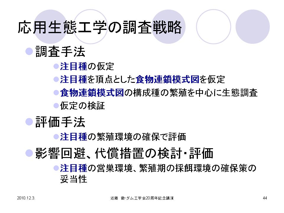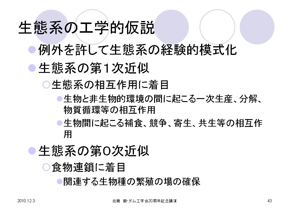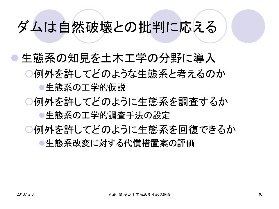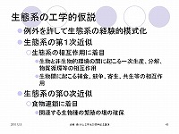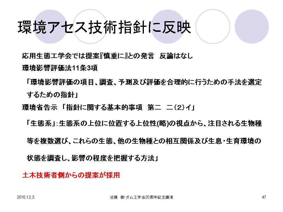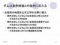 図-40から図-46は、ダムは自然破壊との批判にこたえるものです。さっき話しましたけど、私は、今、応用生態工学会会長をやらせていただいておりますが、工学の中に工学と生物学との間で共通の研究領域ができてきています。我々の調査手法が、環境アセスの技術基準に環境省に取り上げていただいております。