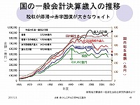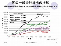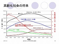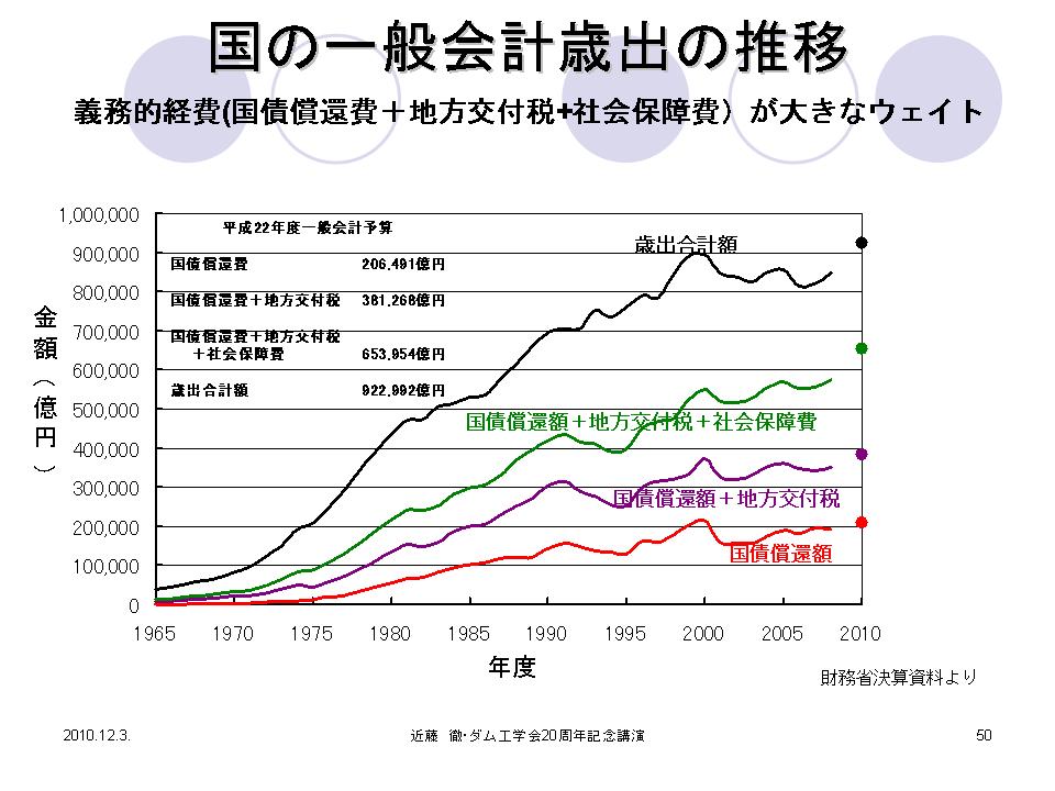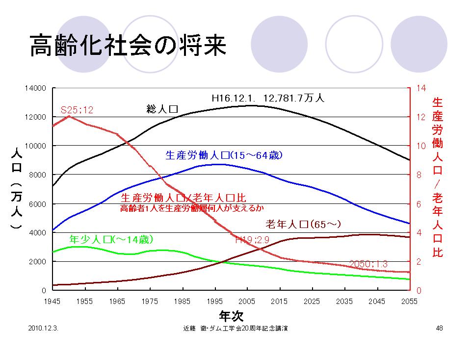 図-48から図-50は、これから高齢化社会になって、我が国はどうなるのかを示しています。今は、後輩にというか、次世代に借金して社会保障に充てているのが現在の政治のあり方です。子供手当なんて子供にやっているのかどうか、親が食っちゃうのかもしれませんし、37兆円の税金に44兆円も借金して、これがほとんど社会保障に向かっています。これを国民がまだ気がつかない。でも、我々が言うと、すぐ公共事業をやって、利権の巣窟にしてしまうと思われているので、非常につらい立場であります。今日、米田先生に来ていただいていますが、先生にはあちこちで公共事業の必要性を言っていただいているのですけど、未来への投資、次の世代に何を残すかというのが非常に大事であるということが言いたくていろいろお話しました。