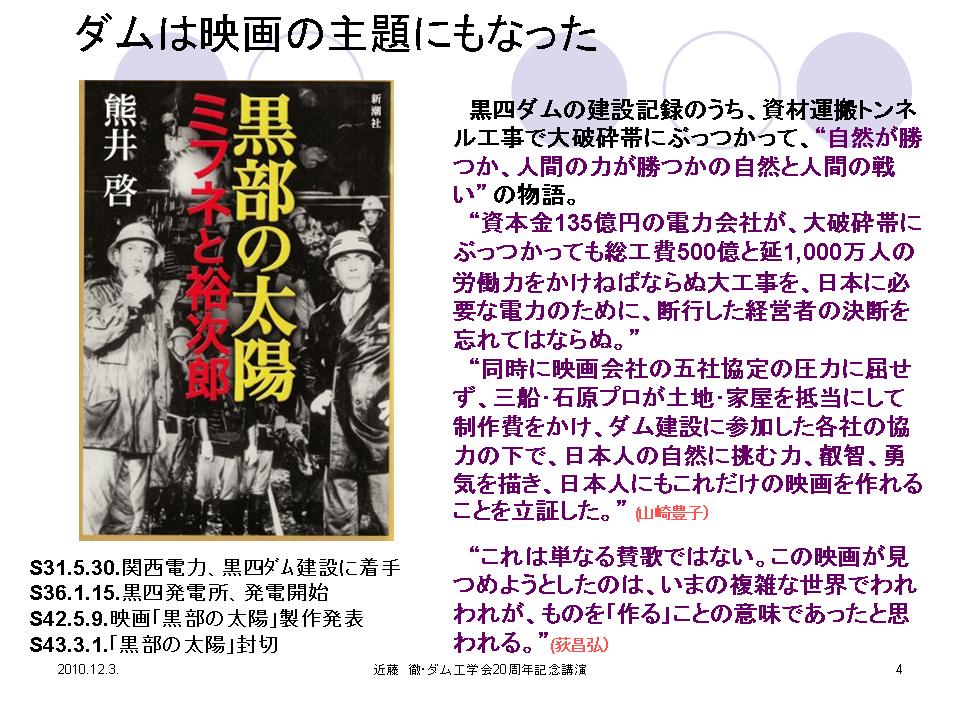 次に図-4ですが、この黒四ダムを主題にして三船敏郎と石原裕次郎が「黒部の太陽」という映画をつくりました。昭和43年ですが、その後、このときの経緯を書いた本を、映画の監督をされた熊井啓が書かれました。そのときの経緯ですので、この本の題名も「黒部の太陽」となっています。映画は、ダム事業の中で、資材運搬をするための関電トンネルの大工事だけを主題にしてできております。