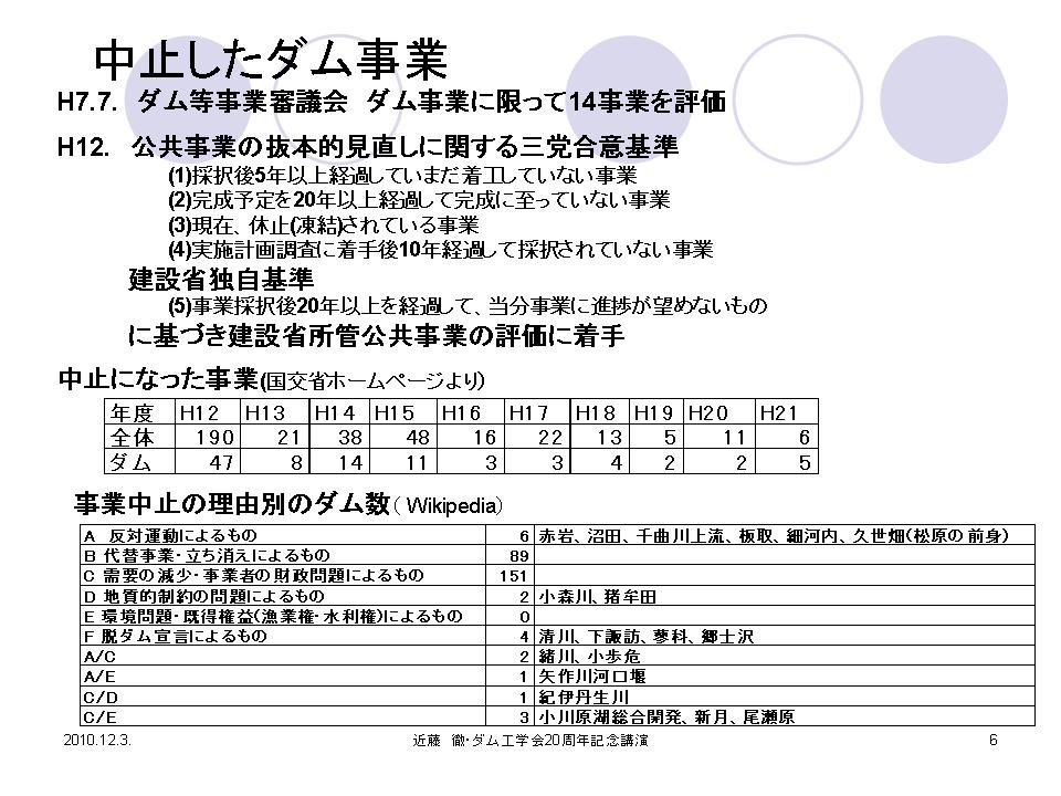 それから、インターネットでウィキペディアを開いて調べると、図-6に示しますが、中止になったダムの一覧表があります。反対運動によって中止になったものが6つ、赤岩ダム、沼田ダム、千曲川上流、板取、細川内、久世畑ダムがあがっていますが、一つ一つ関係者の皆さんに確認すると、例えば沼田ダムが反対運動によったのかどうかというのは疑問で、話題にはなったけれども、反対運動の俎上には上らなかったというのもあります。細川内なんかは、ご承知のように、地元の反対があって中止になった。久世畑というのは、事業化する前の構想ぐらいの段階で中止になったということで、ウィキペディアがどういう資料をどう判断したのかちょっとわかりませんが、そういう事情で中止になっております。