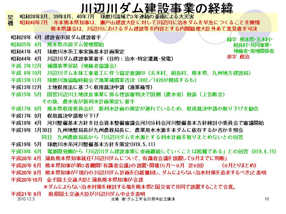 川辺川ダムは多目的ダムであったわけですが、その後、水源をダムに求めるとしてダム事業に参加していた国営土地改良事業、農地のほうの計画が結果的には、ちょっと関係者がいたら申しわけないですが、亡くなった方が同意の判をついていたとか、いろんなことが出てきて、ずさんということだったためダム計画の参加を取りやめたので、国土交通省としては土地収用法の採決をその後取り下げざるを得ないような状況になります。
