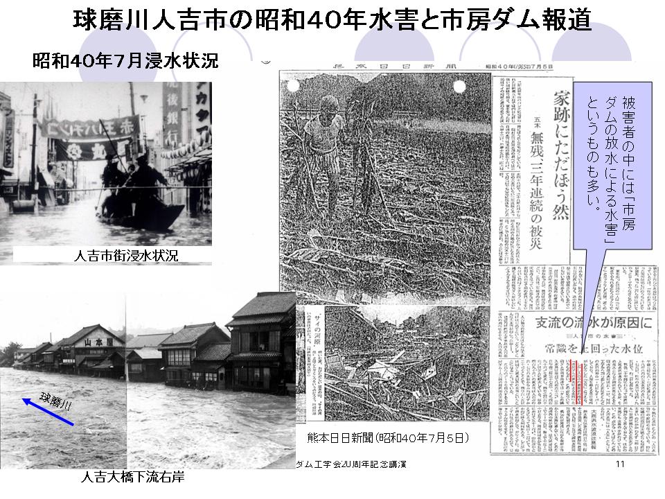 人吉という盆地に2つの大きな急流河川が入っていますから、先ほどお話しした40年水害というのは悲惨だったのであります。ところが、40年の前の38年、39年も水害が起こっていて、40年の水害がとどめの大水害になって、これで熊本県議会も何とかしろというので、ダム計画というものが急速に現実化したんです。しかし寄せられた意見書の中で人吉市の洪水の被害者の中には、市房ダムの放水による水害であったという記載が極めて多いということであります。