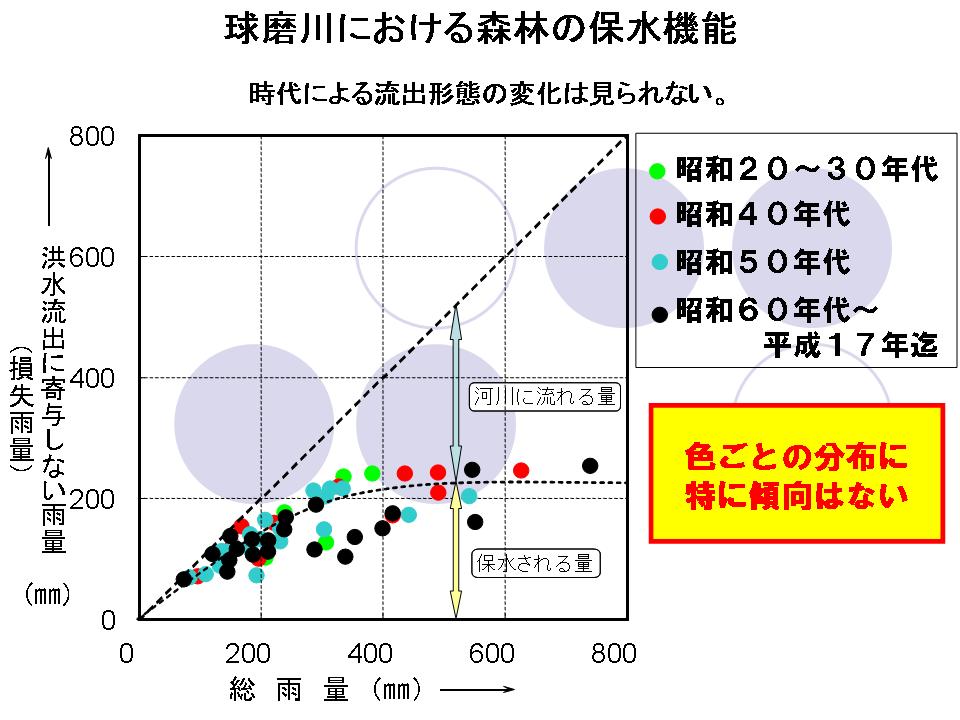そうすると、ここに出てこなかった量というのが、時代別に見てみますと、有意差がないのです。ところが、昭和40年当時は人工林で水は出やすかったけど、最近はよくなっているという学説を流している。これは、私は学説でも何でもないと思いますが、その森林学会で1度検証してもらってこいと言いたかったわけです、こういうことを学会で発表せずにマスコミに発表して、県知事にもこういう資料を出して、これが川辺川ダム不要論に根拠を与え、相当な議論を巻き込んでいました。