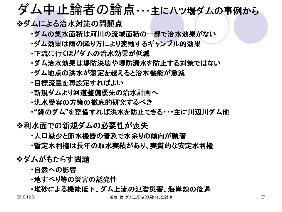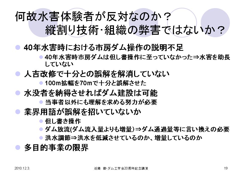 少し話しが長くなりましたが、申し上げたかったのは、マスコミや反対派の非を責める前に、己の足らざるところを顧みよ、私なりの経験の中で、こういうところは直さないとなかなか相手が間違っていて俺は正しいのだというふうにはいかないんじゃないか。これは、ダムは目的ではなくて、安全で豊かな社会実現のための手段である。ダムによらない治水、今検討していますという話ですが、治水の問題、社会の安全の問題は、そう簡単な話ではありません。