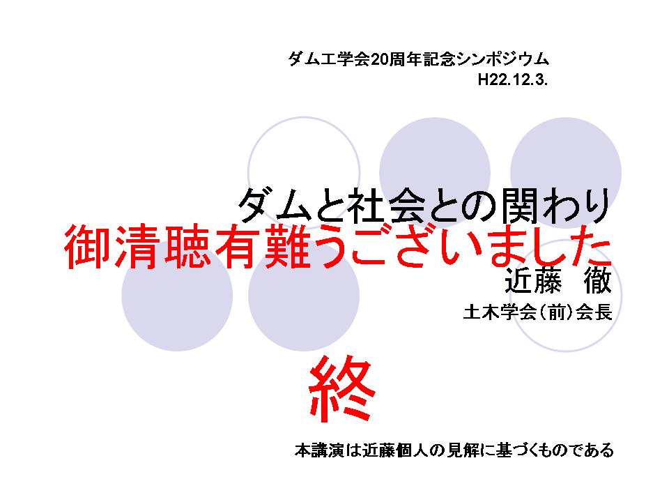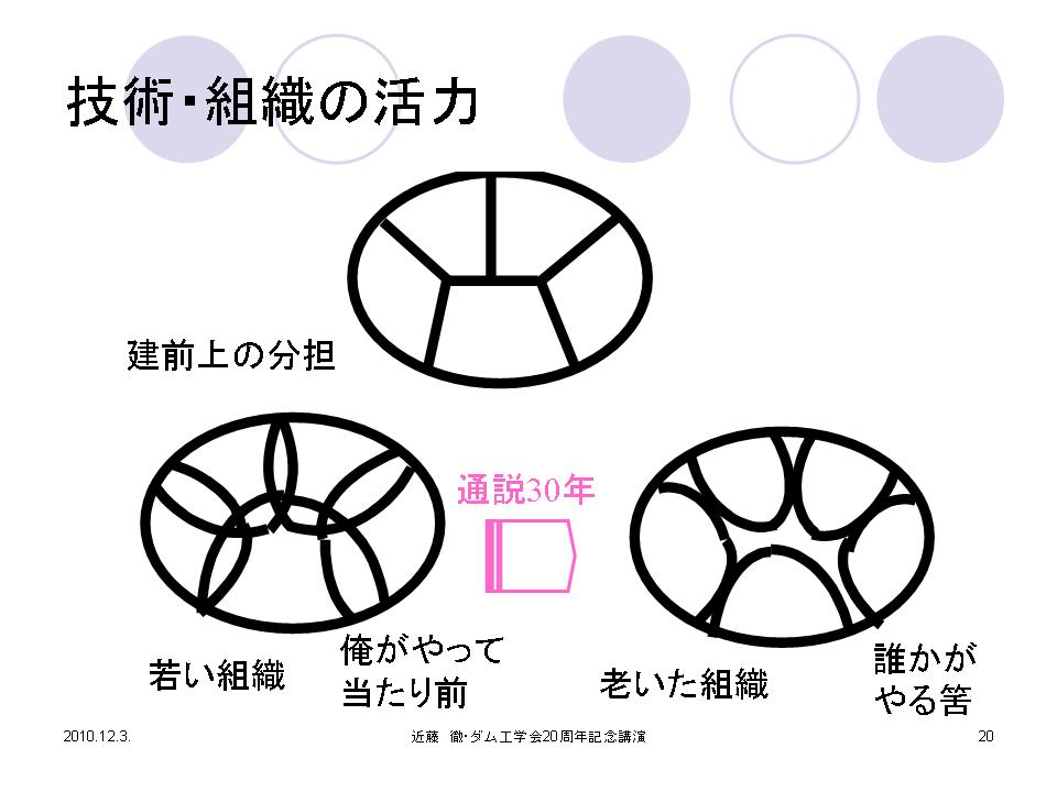 ダム工学会の学の方には関係ないように思われるかもしれませんが、どんな組織でもいろんなところでお互いにカバーするということが、30年たつと、ダム工学会ではあと10年ですから、組織を若々しく保つという努力をしていただくことが大事なのではないかと思います。