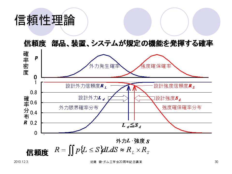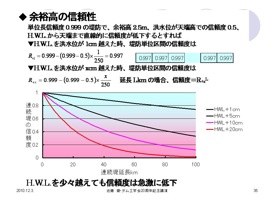 単位長1kmの堤防信頼度が計画高水位で0.999を想定した時、洪水位が堤防天端では信頼度が0.5となるケースを想定してみましょう。その間を信頼度が直線的に変化するとすれば、洪水位が1cm超えたとき、5cm超えたときどうなるのか、またまだ堤防天端からの越流には余裕があり、一部の先生も気楽に余裕高の部分に護岸を張れば大丈夫だよという話をされる。四国の第十堰の議論でもちょっと護岸すれば何ということはないよというのを学者の先生がぺらぺらとしゃべっておられる。これは安全度をむしばんでいることなのです。わずか1cmでも、これが100kmの堤防だと、信頼度は0.99が0.75ぐらいになり、洪水の4回に1回は破堤です。5cmだったら、もう0.3程度下がり、3回に2回は破堤することになる。