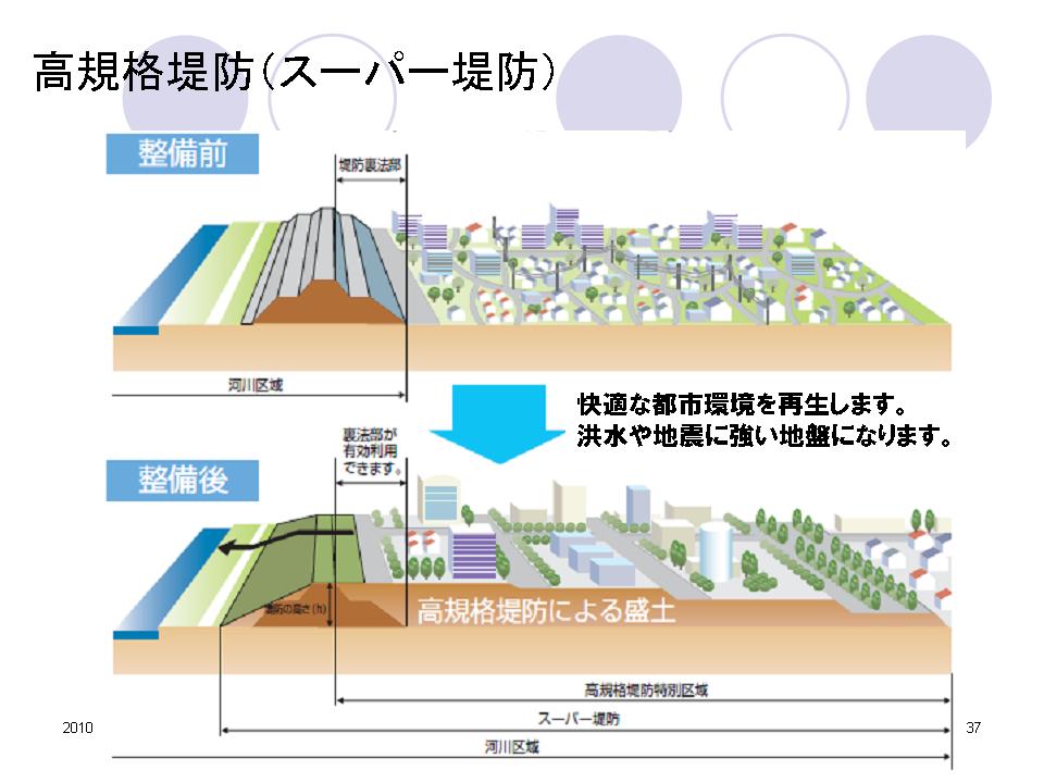 図-37は堤防の信頼性を向上させ、破堤回避を追及したスーパー堤防の説明図です。スーパー堤防については説明を省かせてもらいます。